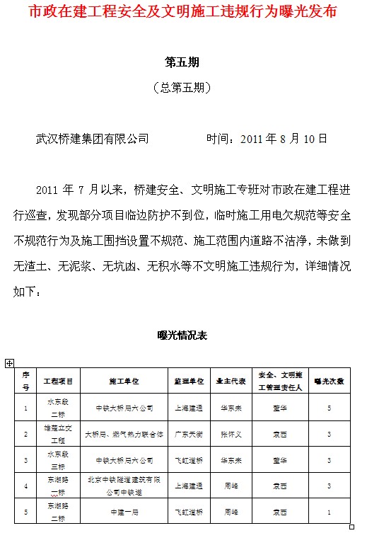 市政在建工程安全及文明施工違規(guī)行為曝光發(fā)布(第五期)