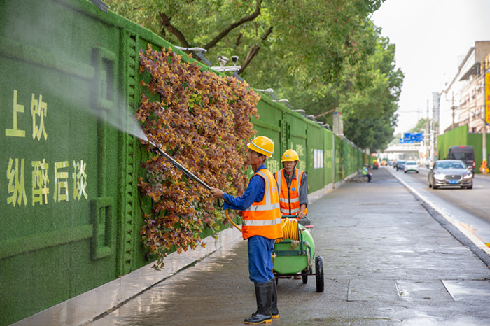 在兩湖隧道東湖段項(xiàng)目現(xiàn)場(chǎng),一塊塊高達(dá)3米的生態(tài)草坪圍擋,將整個(gè)施工現(xiàn)場(chǎng)嚴(yán)絲合縫地圍攏起來(lái),點(diǎn)綴在圍擋上的各種花花草草,不僅扮靚了周邊道路,也讓整個(gè)圍擋充滿(mǎn)生機(jī)與活力。“聊為湖上飲,一縱醉后談”,在這些生態(tài)圍擋上,一幅幅簡(jiǎn)明山水詩(shī)畫(huà)穿插其中,融情于景,與大美東湖渾然一體。