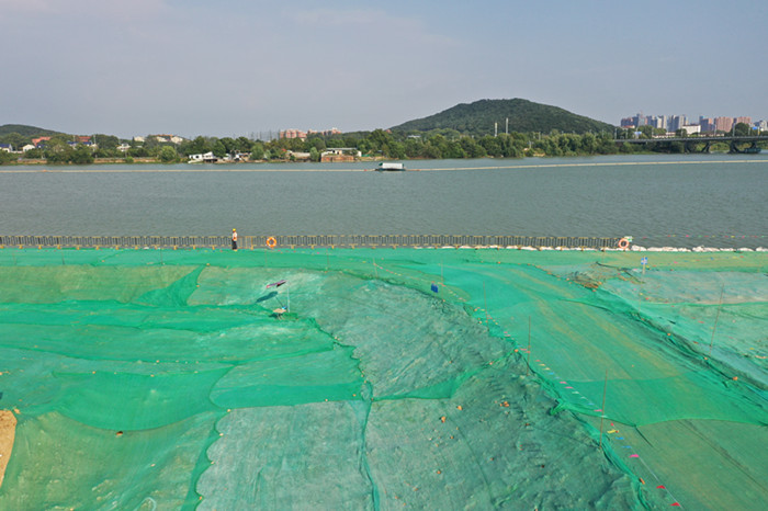 為了防塵工地?fù)P塵影響周邊環(huán)境,在現(xiàn)場(chǎng)設(shè)置了防塵棚,配備了專(zhuān)門(mén)檢測(cè)PM2.5的揚(yáng)塵在線監(jiān)測(cè)設(shè)備,以及霧炮機(jī)等。同時(shí),對(duì)東湖圍堰上的裸土全部采用綠色紗網(wǎng)進(jìn)行了覆蓋,讓整個(gè)圍堰看上去像一條綠色的長(zhǎng)龍橫臥在東湖內(nèi)。