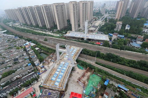 為將工程建設(shè)對(duì)既有線路的影響降到最低,建安街跨鐵路橋轉(zhuǎn)體施工技術(shù)——將橋梁結(jié)構(gòu)在非設(shè)計(jì)軸線位置制作形成后,通過(guò)轉(zhuǎn)動(dòng)體系使其旋轉(zhuǎn)就位。由于京廣線非常繁忙,轉(zhuǎn)體橋必須在鐵路運(yùn)行“空檔期”進(jìn)行,因此分兩次實(shí)施轉(zhuǎn)體,且每次轉(zhuǎn)體都須在2個(gè)小時(shí)內(nèi)完成,轉(zhuǎn)體角度較大、鄰近既有線施工、周邊住宅樓密集等因素更是增加了作業(yè)難度。8月18日,在項(xiàng)目建設(shè)各方的共同努力下,重達(dá)1.4萬(wàn)噸的7號(hào)墩梁逆時(shí)針旋轉(zhuǎn)83度后,與前一天已旋轉(zhuǎn)到位的6號(hào)墩梁體在京廣線上方成功“牽手”。