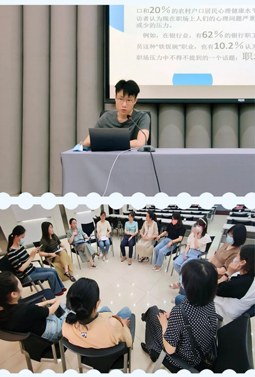 在區(qū)衛(wèi)健局和唐家墩街道的大力支持下,活動(dòng)邀請(qǐng)武漢市優(yōu)撫醫(yī)院的2位專家進(jìn)行授課。鄭文荃老師重點(diǎn)講授了職場(chǎng)人際關(guān)系處理,幫助職工識(shí)別和應(yīng)對(duì)不良情緒,緩解職場(chǎng)焦慮。汪銳老師帶領(lǐng)職工開展團(tuán)隊(duì)互動(dòng)解壓游戲,通過小組討論、自我解析、冥想放松訓(xùn)練等環(huán)節(jié),引導(dǎo)職工進(jìn)行有效溝通,科學(xué)疏導(dǎo)心理壓力。