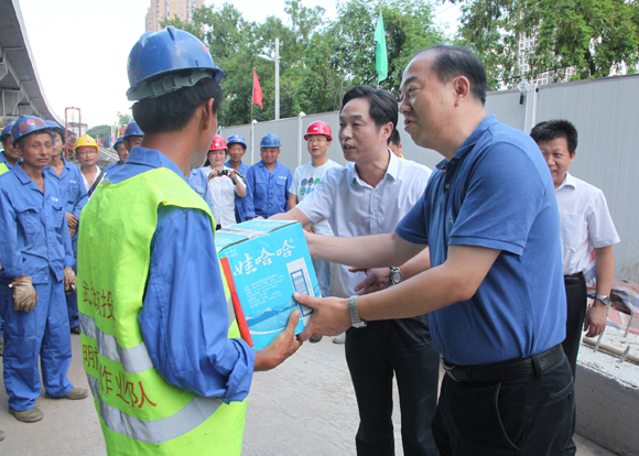 在京漢大道武勝路立交工程現(xiàn)場,胡市長與施工人員一一握手,將防暑降溫品送發(fā)到工人手中,反復(fù)囑咐工人們一定要注意防暑降溫,注意抓好安全生產(chǎn),將安全意識切記于心,并對建設(shè)者們不畏高溫、堅(jiān)守崗位表示感謝和慰問。在認(rèn)真聽取了工程的進(jìn)展情況匯報(bào)后,胡市長要求施工單位在保證質(zhì)量的同時(shí)加快施工進(jìn)度。隨后,胡市長一行分別來到東湖路上已啟用的兩座地下人行通道,實(shí)地查看了行人通行情況和環(huán)境衛(wèi)生情況。