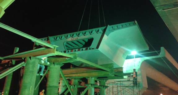 作為解放大道下延線改造工程的關(guān)鍵控制性工程漢黃路高架橋在經(jīng)過近半個(gè)多月鋼箱梁吊裝準(zhǔn)備工作后,在保證安全及交通組織完善的情況下,于2015年4月21日晚開始鋼箱梁吊裝。